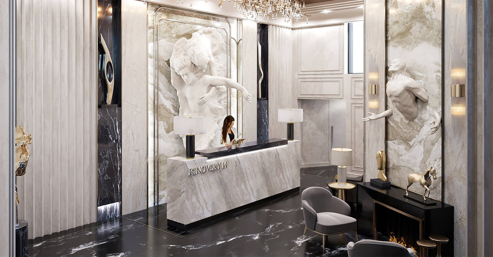 Лобби Runovsky 14 — это гармоничное пространство, которое объединяет две 3-этажные секции бизнес-центра. Современный дизайн интерьера подчёркивает элегантность проекта, создавая атмосферу уюта и делового стиля. Входная группа продумана до мелочей, чтобы обеспечить удобство и функциональность для резидентов и гостей.
